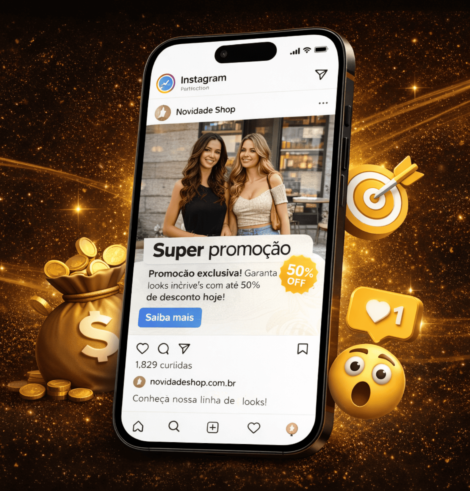 Anúncios no feed, stories e reels para aumentar alcance, engajamento e atrair novos clientes.
